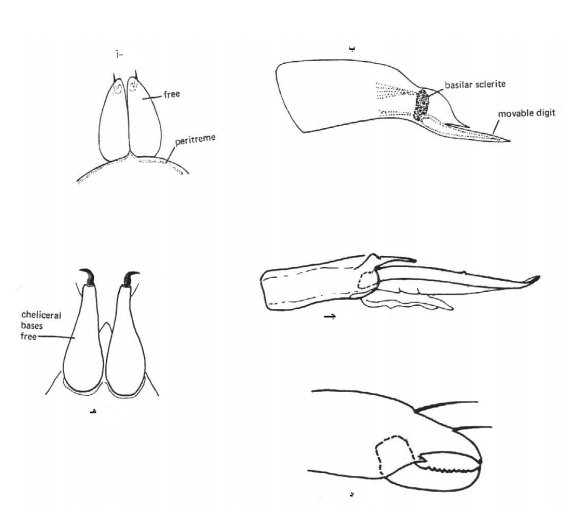 أ– الفكوك تشبه فكوك ذات الثغر المتوسط أي تتكون من سلامية متحركة وأخرى ثابتة كما في عائلة Rhagidiidae (الشكل 2-د).