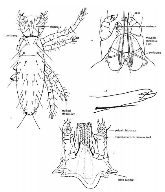ح- في حالة حلم الجرب يلاحظ أن الفكوك متضخمة أيضا وتتكون من سلامية ثابتة وأخرى متحركة وعادة تكون مسننة من الداخل ويوجد على السطح البطني في حالة الحلم الاكاريدي Acaridae مهماز مخروطي Conical Spur وبجانبه شوكة فكية Mandibular Spine وتوجد عضلات متصلة بالفكوك وتساعد على تحريكها. في حالة فكوك القراد يلاحظ أن الحافة المتحركة تكون جانبية والتسنين يكون للخارج وليس للداخل (الشكل 3-د). أما في حالة الحلم الخنفسي فيلاحظ أن الفكوك تتكون من سلامية متحركة وأخرى ثابتة إلا أنها تظهر متضخمة وكبيرة الحجم جدة.