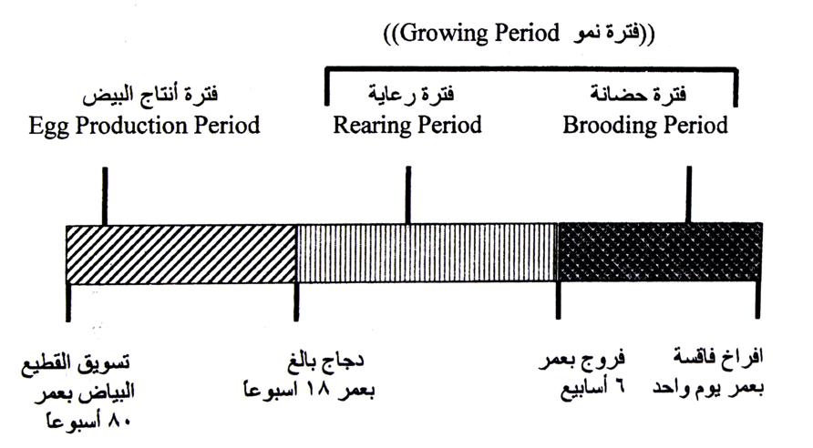 1. فترة النمو ( Growing period ) وتمتد هذه الفترة من عمر يوم واحد ولغاية 18 أسبوع وكما هو ملاحظ بالشكل ادناه. وتعتبر هذه الفترة من الفترات الحرجة ( Critical period ) لأنها فترة تحضير القطيع البياض للفترة الإنتاجية. فالهدف الأولي لتربية القطيع البياض هو الحصول على أعلى إنتاج من البيض الجيد النوعية خلال الفترة الإنتاجية وأن هذا الهدف يتطلب تنمية القطيع البياض وفق أسلوب علمي دقيق يضمن أيصال القطيع البياض الى النضج الجنسي بعمر ووزن مناسب يؤهله للإنتاج العالي خلال الفترة الإنتاجية. وأن أي خطأ بالتربية خلال فترة النمو سوف لا يمكن تصحيحه خلال الفترة الإنتاجية. بعض الشركات العالمية والكتب العلمية تفضل تقسيم الفترة الإنتاجية الى فترتين هما: