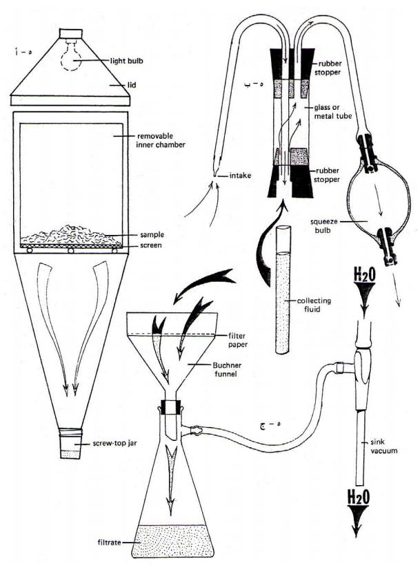 أ– استخدام قمع بيرليزي - توليكرن Tullgren Funnel -Berlese ويعتمد عمل هذا القمع على استخدام مصدر حراري يعمل على طرد الأكاروسات بعيدا باتجاه قنينة الجمع الموجودة أسفل هذا القمع وهو تحوير لقمع بيرليزي. حيث يتم وضع عينة التربة على الغربال الموجود في قاعدة القمع فيما يوجد في غطاء القمع مصدر حراري هو عبارة عن مصباح مما يعمل على طرد الأكاروسات من العينة وإجبارها للنزول إلى أسفل القمع والسقوط أخيرا في قنينة جمع الأكاروسات (الشكل التالي). إن قوة المصباح (الواطية) المستخدمة في القمع يعتمد بالدرجة الأساس على: