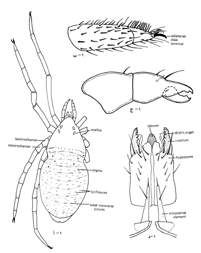 الشكل (1) عائلة 1 Opilioacaridae-أ : ظهر أنثى Opilioacarus sp ، 1-ب : ساق ورسغ القدم الملمسي ، 1-ج : الفكوك الملقطية ، 1-د : الجهة البطنية للجسم الفكي ولوحة الاسترنة المقسومة. (عن Krantz ، 1978)