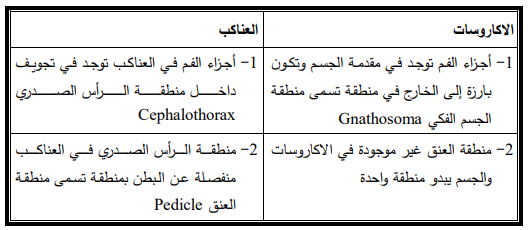 مما سبق يتبين أن الأكاروسات تمثل مجموعة متميزة من مفصليات الأرجل التي تختلف عن الحشرات والعناكب وفيما يلي أهم الفروق بين الأكاروسات والحشرات والعناكب:
