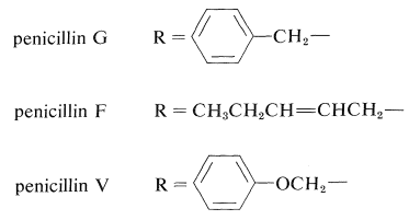 Fermentation can produce penicillins that differ only in the nature of the side-chain group RR. The common natural penicillin is penicillin G, in which R=R= phenylmethyl (benzyl):