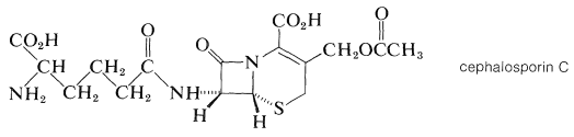 The cephalosporins are antibiotics produced by the bacterial strain cephalosporium. They are closely related to the penicillins. Thus cephalosporin C has a β-lactam ring but a six-membered sulfur-containing ring: