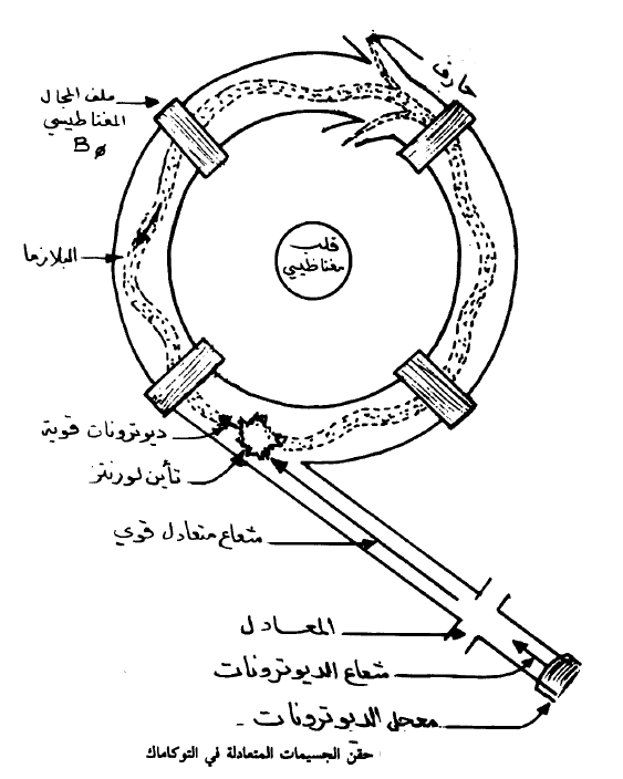 يبين الشكل (4) تركيب التوكاماك. حيث يبين الشكل (4 .ب) تفاصيل المجالات المغناطيسية الناتجة وكذلك التيار. تمر البلازما خلال الحلقة (Torus) حيث يؤثر عليها المجال الحلقي (∅B) والمجال القطبي (Bθ) وينتج عن ذلك مجال محصل يعمل على احتواء البلازما لتتدفق في الاتجاه المبين. كما وينتج عن الملفات الابتدائية تدفق تيار كهربي (i) يمر عبر البلازما الموصلة ويعمل على تسخينها.