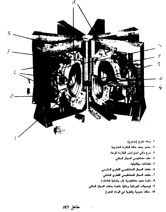 نبين في الشكل (1) مفاعل JET الذي يعتمد مبدأ التوكاماك لاحتواء البلازما عن طريق المجالات المغناطيسية المتعامدة. وتعني كلمة JET اختصاراً لكلمات Joint European Torus أي الحلقة الأوروبية المتحدة. وهذا المفاعل يعد بإمكانية توليد الطاقة الاندماجية في المستقبل والأبحاث فيه مستمرة. وذلك للوصول إلى غاز مؤين تأييناً كاملاً (بلازما) وعند درجة حرارة k108 بينما تصل كثافة الجسيمات إلى 1020 إيون - الكترون لكل متر مكعب. ويجب أن يحتفظ بهذا الغاز بعيداً عن جدار الحلقة لمدة ثانية واحدة على الأقل، وذلك باستخدام مجالات مغناطيسية قوية.