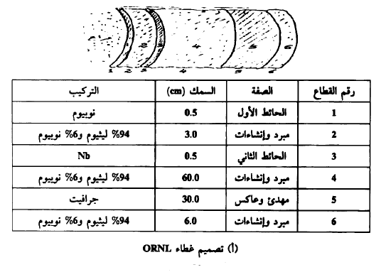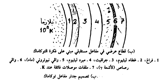 نبين في الشكل (2) تصميم جدار مفاعل توكاماك. حيث نجد أن النيوترونات الناتجة من اندماج الديوترون مع التريتيوم تستطيع الهرب من البلازما متجهة نحو جدار الوعاء حيث تسقط على مجموعة من الطبقات تتكون من مبرد ومهدى ودرع واقي من النيوترونات. في الشكل (2 .أ) نجد تصميم الغطاء وفق ORNL أي OaK Ridge National Laboratory حيث تتكون الطبقات من النوبيوم (Nb) والليثيوم (Li)، حيث يعتبر النوبيوم كمادة إنشاءات أما الليثيوم