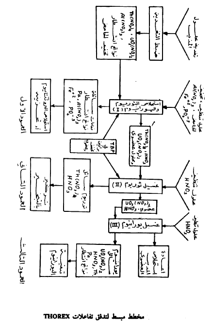 يتم استخلاص اليورانيوم - 233 من قضبان وقود الثوريوم المستهلك في المفاعلات الإنتاجية وذلك بإعادة المعالجة الكيميائية للوقود. يبين الشكل (1) مخطط مبسط لتدفق هذه التفاعلات والتي تعتمد تقنية THOREX أي (Extraction by Thorium Oxide Recovery) وهذه تعني استعادة أكسيد الثوريوم بالاستخلاص. يتم إذابة وقود اليورانيوم - 233 / ثوريوم. في محلول يتكون من: حامض نيتريك مركز جداً (13M)، حامض هيدروفلوريك (0.05) ونترات الألمنيوم (M 0.1) ويسخن هذا المحلول إلى درجة الغليان. ثم يتم التخلص من الفضلات الصلبة في المحلول بواسطة الطرد المركزي. ثم تمر محاليل نترات الثوريوم واليورانيوم إلى عمود الاستخلاص الأول (كما بالشكل 1) حيث تتحرك في اتجاه معاكس لتدفق TBP المذاب في مذيب هيدروكربوني. وبينما يتدفق هذا المحلول إلى أعلى فإنه يعمل على إذابة نترات الثوريوم واليورانيوم كما وأن نواتج الانشطار ونترات البروتكتانيوم والألمنيوم تغادر هذا العمود عند القاع حاملة معها محلول التنظيف الذي يضاف إلى العمود عند القمة. ويجب العناية هنا بالضبط الكيميائي لهذه التفاعلات لكي نتمكن من فصل نواتج الانشطار (وخاصة 95 - Zr) عن الثوريوم. كما ويجب فصل (Pa- 233) من النفايات ذات التركيز العالي HLW. لأن هذا الأخير يسبق (233-U) في السلسلة الإشعاعية. وكتفاعل بديل لما سبق فإنه يمكننا ترك الوقود الإنتاجي ليبرد ونسمح لتحلل البروتكتانيوم إلى يورانيوم - 233.