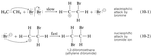 The first step (which involves electrophilic attack by bromine on the double bond) produces a bromide ion and a carbocation, as shown in Equation 10-1.