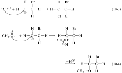 As we know from our study of SN1 reactions , carbocations react readily with nucleophilic reagents. Therefore in the second step of the bromine-addition mechanism, shown in Equation 10-2, the bromoethyl cation is expected to combine rapidly with bromide ion to give the dibromo compound. However, if other nucleophiles, such as Cl⊖ or CH3OH, are present in solution, they should be able to compete with bromide ion for the cation, as in Equations 10-3 and 10-4, and mixtures of products will result: