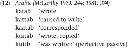 All of the words in (12) have something to do with writing, and all share the consonants ktb, although in a couple of the forms, there’s more than one t. All the active verb forms have the vowel a; the passive verb form has the vowels ui. Each word has a different pattern of vowels and consonants, and each expresses a slightly different concept. What we find in Arabic is called templatic or root and pattern morphology.