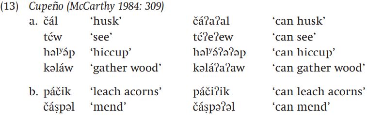 If the only or the second vowel is the stressed vowel, as is the case in the examples in (13a), the habilitative form adds two more syllables, each of which start with [ʔ]. The final vowel of the stem is spread to the new syllables. The situation is slightly different if the first vowel of two is the stressed vowel, as the examples in (13b) show. In that case, the template has only one more syllable than the stem, again with the glottal stop as the consonant, and the vowel supplied by the last stem vowel.