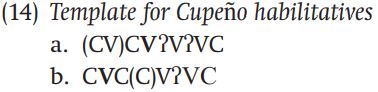 One way of looking at the habilitative forms in Cupeño is that they conform to templates like those in (14):
