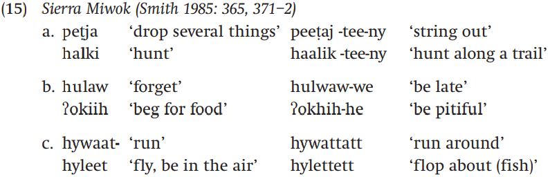 A final example of templatic morphology comes from another Native American language, Sierra Miwok (Penutian family, spoken in California). In this language, new words can be derived by adding a suffix which then supplies a specific template for the base. Consider the examples in (15):