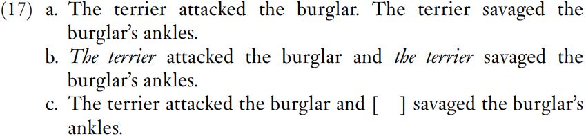 Example (17a) contains two separate clauses. In (17b), the clauses are conjoined by and; this gives a single sentence consisting of two clauses, each beginning with the terrier. Example (17c) is produced by deleting the second occurrence of the terrier. The square brackets in (17c) mark the site of the missing words, which are said to have been ellipted. Example (17c) is an example of ellipsis. The important point about this type of ellipsis is that it applies only to complete phrases. Sentences such as *The fierce terrier attacked the burglar and terrier savaged the burglar’s ankles are incorrect, because terrier must be preceded by the. Example (17b) is peculiar because speakers and writers of English do not repeat phrases in this manner but either ellipt the second occurrence of the phrase as in (17c) or use a substitute such as he, she or it. The burglar occurs twice, once as the phrase at the beginning of (17b) and again in the bigger phrase the burglar’s ankles. In the latter phrase the burglar, or rather the burglar plus the possessive suffix ’s, is replaced by his: The terrier attacked the burglar and she savaged his ankles.