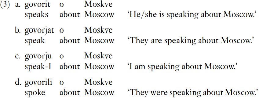 Examples (3a–d) all refer to an event of speaking about Moscow: (3a) and (3b) place that event in present time; the speaker, as it were, says ‘I am speaking to you now and they are speaking about Moscow’. Example (3d) presents the event in past time; the speaker can be imagined as saying ‘I am speaking to you now and at some before this they were speaking about Moscow’. Information about the time of an event is signalled by the difference in form between govorit and govorjat on the one hand and govorili on the other, the l in govorili indicating past time. Such differences in verbs are said to express tense.