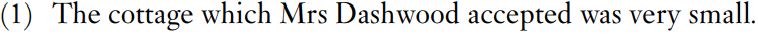 Assume that the source of the relative clause which Mrs Dashwood accepted is Mrs Dashwood accepted which, with the pronoun which in the usual slot for direct objects. The pronoun which is moved to the front of the clause, in fact to a special slot for complementisers outside the main body of the clause. This enables us to show both that which is the direct object of accepted and that it is the complementiser of the relative clause. (This treatment appeals to the idea introduced on constructions: they can be thought of as arranged in a network with specific paths through the network from construction to construction. We looked only at main clauses, but the idea is here extended to the relationship between main and subordinate clauses.) The analysis of relative clauses can be made more complex if we take at its face value the definition of pronouns as substituting for nouns – more accurately, for noun phrases. One line of analysis would take the source of the above relative clause to be Mrs Dashwood accepted the cottage, with which being substituted for the cottage and then being moved to the complementiser slot.