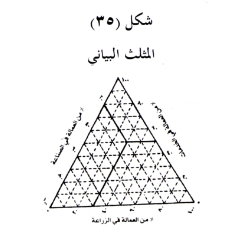ويتحدد موقع كل نقطة على هذا المثلث، بإنشاء ثلاثة محاور إحداثية، متوازية مع الأضلاع المجاورة, ففي الشكل (٣٥) الذي يبين نسب العاملين في الزراعة والصناعة والخدمات، يظهر أن نسبة العاملين في الزراعة قد رسمت موازية لمحور الصناعة، ونسبة العاملين في الصناعة موازية لمحور الخدمات، ونسبة العاملين في الخدمات موازية لمحور الزراعة.