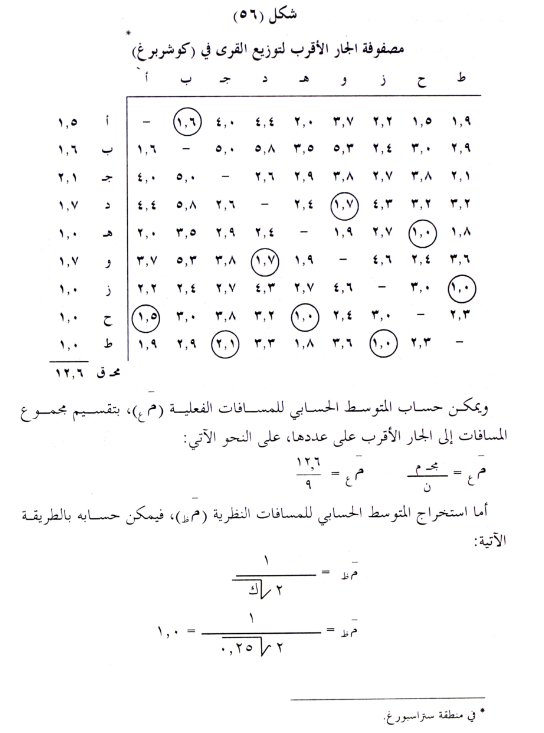 نقيس المسافة لأقرب جار، لكل مركز من المراكز البشرية ضمن المنطقة المدروسة، ثم نجمع هذه المسافات ونقسمها على عددها، فنحصل على المتوسط الحسابي للمسافات الفعلية. ويمكن الوصول إلى النتيجة نفسها، بقياس المسافات الفاصلة بين المراكز البشرية (بالسنتيمتر)، وتسجيل القياسات في مصفوفة، وتمييز الجار الأقرب بدائرة، كما هو واضح في الشكل (56).