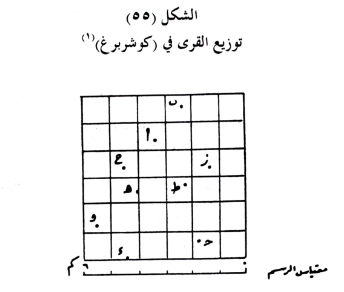 فإذا أردنا التعرف على نمط التوزيع المكاني لمجموعة المراكز البشرية، المبينة في الشكل ٥٥، اتبعنا الخطوات الآتية: