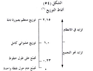 ويتضح مما سبق، أن المصطلحات المستخدمة محدودة، لا تزيد عن ثلاثة: متجمعة (Clustered) ومنتظمة (Regular) وعشوائية (Random)، ولكن القرينة تشمل قيماً عديدة لتحديد أنماط التوزيع المختلفة، فحينما تكون القرينة ٩ , ١ مثلا، فهذا يعني أن التوزيع يميل إلى الانتظام، ولكنه ليس تاماً. وهكذا نستطيع، بهذه الطريقة أن نتحدث بلغة أكثر دقة وموضوعية من لغتنا الوصفية السابقة.