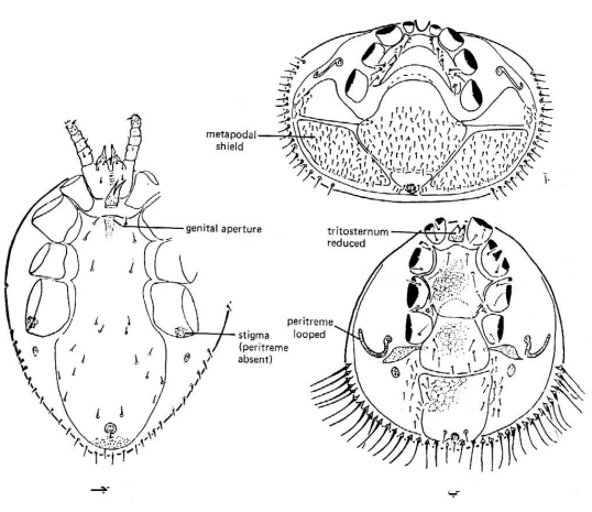 الشكل (1) العائلة Varroidae. أ: بطن أنثى النوع (.Varroa jacobsoni (Oud ، ب: بطن أنثى النوع (.Euvarroa sinhai (D & B، ج: بطن ذكر النوع السابق (عن Krantz ، 1978)