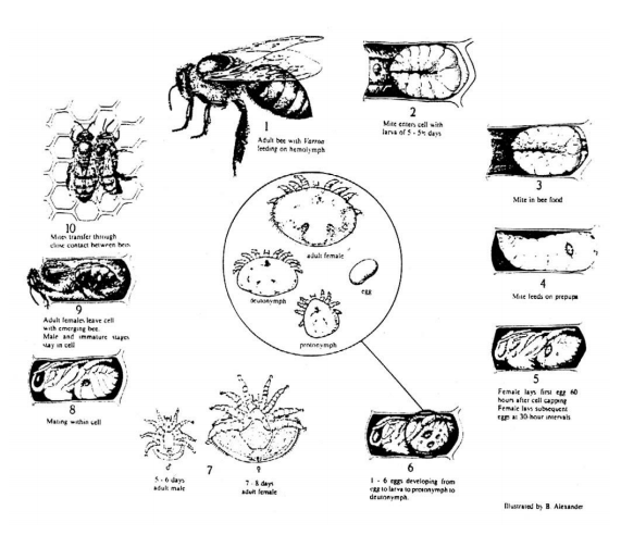 الأنثى البالغة للفاروا تعيش على شغالات وذكور نحل العسل وغالبا ما توجد في منطقة البطن على الأغشية بين العقلية أو بين المنطقة البطنية الصدرية كما قد تشاهد أحيانا أسفل الصدر وتحمل على النحل بقوة بواسطة أرجلها حيث تتحرك بسرعة على جسم النحل. تتغذى أفراد الفاروا بأطوارها المختلفة عن طريق عمل ثقب في الأغشية بين العقلية لحلقات البطن وامتصاص الهيموليف حيث أن أجزاء فمها محورة لهذا الغرض. تضع الأنثى الواحدة بين 3-8 بيضة، يفقس البيض بعد فترة قصيرة عن يرقات تبقى داخل قشرة البيضة ويستغرق هذا الطور 24 ساعة تنسلخ بعدها إلى حورية أولى التي تتغذى على هيموليف يرقات وعذارى النحل لمدة 48 ساعة تنسلخ بعدها إلى الحورية الثانية التي تستمر بالتغذية على الهيموليف لعدة أيام أخرى قبل الانسلاخ إلى الحيوان البالغ. الذكور صغيرة الحجم طولها 715 مايكروميتر وعرضها 700 مايكرومتر، لون الذكر شاحب، الفكوك الملقطية متحورة بشكل جيد لنقل الحيامن وهي لا تتغذى. عملية التلقيح تتم في العين السداسية والتطور من البيضة إلى الحيوان البالغ يستغرق 6-7 أيام للذكور و 8-9 أيام للإناث. أما الذكور وأفراد الحلم الأخرى التي لا تصل إلى مرحلة النضج الجنسي فإنها تبقى في العيون السداسية ثم تموت. أما الإناث البالغة فتغادر العين السداسية مع النحل الخارج حديثا لتعيد الإصابة ثانية وهكذا (شكل 2).