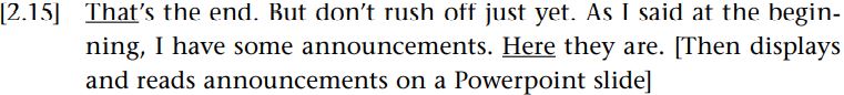 That points back to the preceding discourse (i.e. the lecture); here points to upcoming discourse. Given that we are now dealing with textual links, this category of deixis is not so pure. It also overlaps with the notion of anaphora, which we will discuss in the following section, though it is in principle distinguishable on some counts, as we will note.
