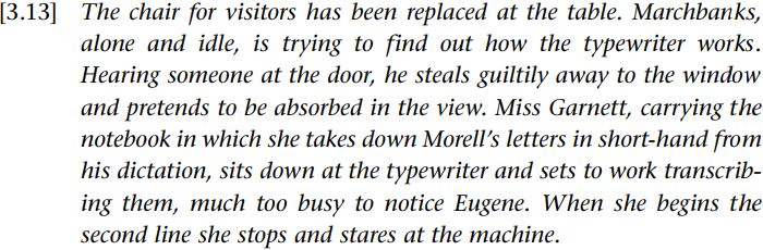 The existence of a chair for visitors is hardly common knowledge, but it is presupposed in the definite noun phrase the chair for visitors, and in the light of this trigger we fill in one element of this fictional world created within our model. One could make similar remarks for the other definite noun phrases, the table, the typewriter, the door, the window and so on. Note the proper nouns presupposing the existence of certain characters. We also have a number of change-of-state verbs. Replaced presupposes that something was there in the first place; steals ... away to presupposes that he was not there in the first place; takes down presupposes that they were not already taken down; and so on. Trying presupposes that he has not succeeded in getting the typewriter to work, but the WH-structure how the typewriter works presupposes that it does work. In the final sentence, the WH-structure at the beginning presupposes that she had begun the second line; the change-of-state verb begins presupposes that she had not started, whereas stops presupposes (by that point!) she had at least started.