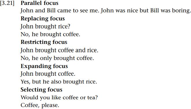 Is considered an important feature of focus (see especially Chafe 1976), whether semantic or cognitive. In the example above discussed in relation to prosody, the fact that Jonathan gave his students chocolate implicitly involves a contrast both with his usual lack of generosity and with the usual behaviors of others. Of course, such a contrast can be couched in terms of deviation, as articulated in foregrounded theory. There is a contrast with the known regularity of other behaviors. This is more of a cognitive contrast. In the literature on information structure, contrast involving semantic focus is usually taken to involve the contrast of an item with a restricted set of alternatives (see, for example, the special issue on contrast, Repp 2010; also Rooth 1992). Miller (2006: 512) provides a useful list of various types of focus, each with an example: