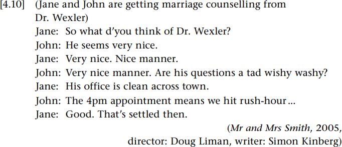 In the course of this next conversation, example [4.10], the two characters reach a consensus that it is not worth going for their appointment for marriage counselling with Dr. Wexler: