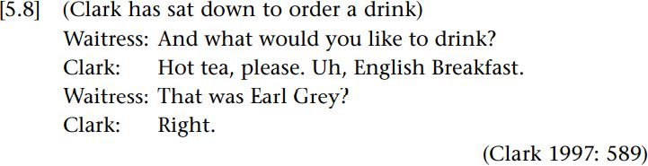 Here we can see that Clark is taken to be ordering Earl Grey tea by the waitress, and thus what he has said is that he would like Earl Grey contrary to what he has just said1. He notes that “I initially intended to be taken as meaning one thing, but I changed my mind” (ibid.). Here it is the recipient’s understanding of the meaning representation of what is said, rather than that of the speaker, which has taken precedence.