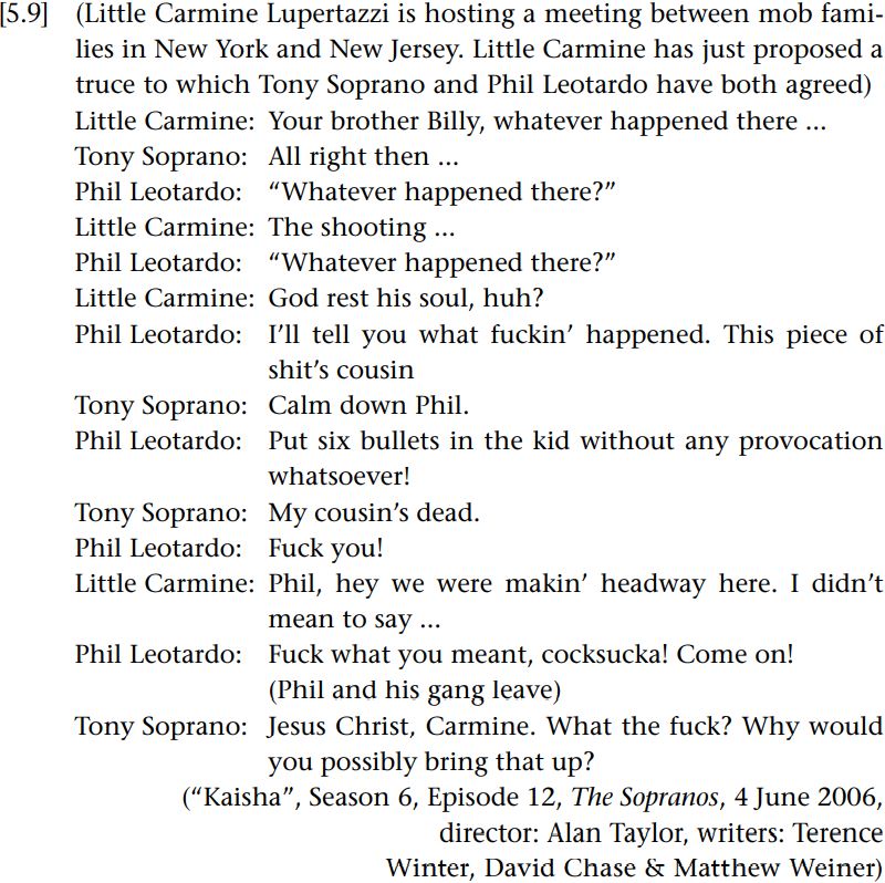 The excerpt begins with Little Carmine bringing up the death of Phil Leotardo’s brother, Billy. Phil becomes incensed by the fact that Little Carmine has brought this topic up, and insults Tony Soprano when Tony tries to calm him down. Little Carmine then attempts to correct Phil’s “misconstrual” of what he meant by his question whatever happened there, but he is interrupted by Phil, who emphatically rejects such a claim. Tony’s subsequent utterance after Phil and his gang leave lays the blame not on Phil for misunderstanding what Little Carmine meant by his question, but rather on Little Carmine himself. What takes precedence here, then, is the recipient’s meaning in spite of what the speaker claims to have intended.