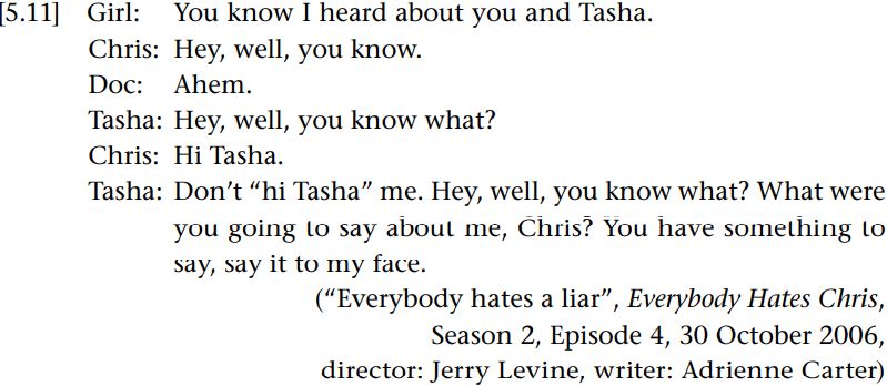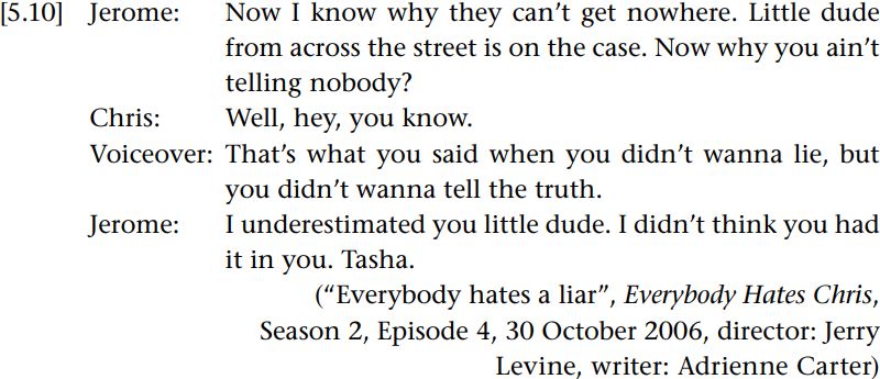 It becomes clear, then, that one can be taken as saying2 something by not saying1 something when the opportunity arises. This kind of “not saying” is a type of pragmatic meaning which does not fall under the received definition of implicature as a thought, or in this case a belief of the speaker that is intended by the speaker to be recognized by the recipient as intended (Haugh 2013d). Yet the characters, or at least Tasha and Jerome, nevertheless treat it as a kind of speaker meaning. This illustrates how raising questions about whose meaning we are talking about can pose challenges for the way in which we define speaker meaning in pragmatics. The way in which some utterances can offer a set of possible interpretations amongst which a recipient can choose is also a feature of many pragmatic acts, a point that will be discussed in further detail.