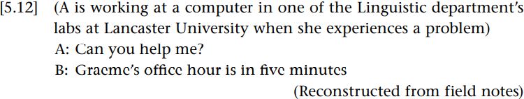 The question is, how does A work out what B means by his response here? From a Relevance theoretic perspective, A proceeds on the assumption that B’s utterance is optimally relevant to her. In this situation, B’s utterance provides ready access to both an explicit and implicit premise. The explicit premise arises from a pragmatically enriched understanding of B’s response (what is termed an explicature), namely, that the person they mutually know as Graeme has allocated a specified time to do things in that mutually known workplace in five minutes from the time of the speaker’s utterance. The implicit premise made available is the contextual assumption that “Graeme helps with computing problems” (which is triggered in part by the existential presupposition that Graeme has an office hour). By combining this explicit premise with this implicit premise, A can arrive at the implicit conclusion that B thinks Graeme can help A with her computing problem, and furthermore that he thinks A should ask Graeme for help rather than him (i.e. two related implicatures). This overall interpretation presumably satisfies A’s expectations of relevance.