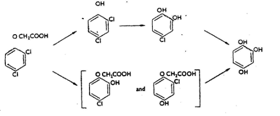 أ) الـ ring - substitution: - ومن أكثر الأمثلة شيوعاً على هذا التفاعل هو ابدال حلقة الكلورين Chlorine بمجموعة الهيدروكسيل مثال ذلك مبيد ال 2,4 D.