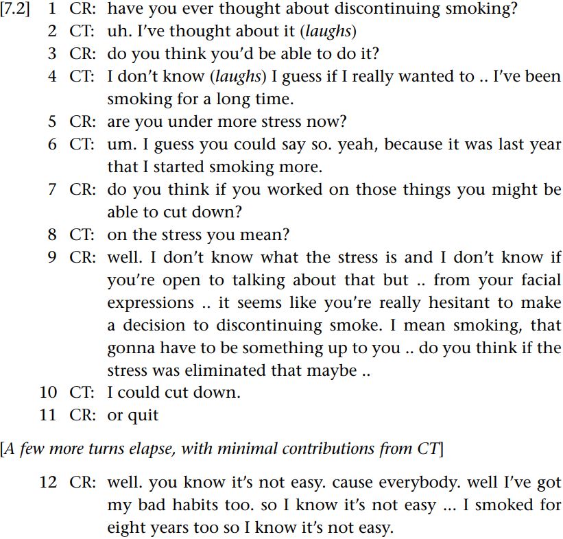 CR’s goal is to get CT to stop smoking. She repeatedly uses the speech act of request. However, this request is realized indirectly. A very direct request might be “quit smoking”. In contrast, in turn 1 her request is couched as a question about whether CT has ever thought about stopping, and in turn 3 it is a question about what CT thinks of her ability to stop. This does not meet with success, so in turn 5 CR tries another tack, engaging CT in talk about a possible cause of the smoking, rather than directly talking about stopping. Then in turn 7 CR links the cause to cutting down. Note how indirect this is: it is phrased as a question about whether she has thought about whether she would be able to cut down. CR’s strategy thus far is largely off-record politeness: by flouting the maxim of Relation (it is improbable in this context that CR is only inquiring about CT’s thoughts) and the maxim of Quantity (what is to be cut down is not specified), she leaves it to CT to infer that she is requesting her to stop smoking (i.e. CR’s implicature).2 Turn 7 is further modified by hedging the possibility that she has the ability to cut down (cf. might), and making it conditional (cf. if you worked on those things). These linguistic strategies – conditionals and hedges – are the stuff of negative politeness. Note that a downside of this kind of indirectness is the loss of pragmatic clarity. In turn 2 CT either chooses to ignore or possibly was not aware of CR’s implicature requesting her to stop, and just replies to the literal question (I’ve thought about it). Similarly, after turn 7 CT either exploits or is simply confused by the lack of clarity regarding what she should cut down (on the stress you mean). In turn 9 CR probes what the reasons for not giving up might be. The frequent hesitations signal tentativeness, a reluctance to impose, and thus can be considered a negative politeness strategy. In the final part of that turn, she again uses a question, but notably she refrains from completing the question and spelling out the other half of the if-structure (i.e. if the stress is eliminated, the smoking will be). This could be considered an example of don’t do the FTA. Thus far, CR does not seem to be making much progress with her goal, and in the following turns (not presented in the text above) she makes only minimal responses. In turn 12 CR tries a completely different tack. She not only self-discloses (I’ve got my bad habits too ... I’ve smoked for eight years too so I know it’s not easy), but reveals information that (a) is negative about herself, and (b) is something that she has in common with CT. The kind of strategy in (a) is not well covered in Brown and Levinson, but could be accounted for by Leech’s Modesty maxim (minimize praise of self/maximize dispraise of self); the strategy in (b), claiming common ground, is an example of positive politeness. Importantly, note the effect of this on CT. For the first time, CT has engaged CR in conversation: instead of simply responding in a fairly minimal way, she asks a question (Did you quit?).