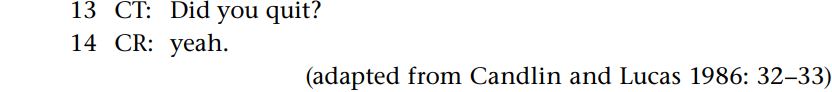 Brown and Levinson’s politeness theory has been applied, in full or part, to a wide variety of discourses, situations and social categories, including “everyday” conversation, workplace discourse, job interviews, healthcare discourse, political discourse, media discourse, literary texts, historical texts, gender and conflict, not to mention a huge literature examining intercultural or cross-cultural discourses. For the purposes of exemplifying the kind of analysis that can be done, we will examine an example of healthcare discourse. Our data is taken from Candlin and Lucas (1986), where politeness issues are in fact only very briefly touched on. The lineation has been slightly changed. The context is an interview at a family planning clinic in the USA. CR is a counsellor, who interviews clients before they see the doctor. CT is a client, who is pregnant.
