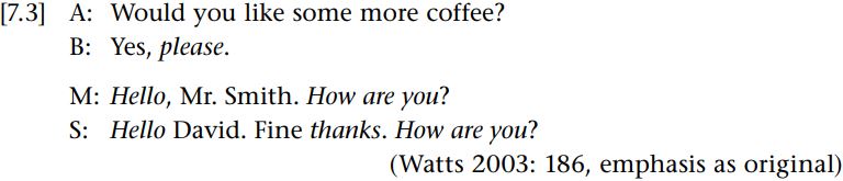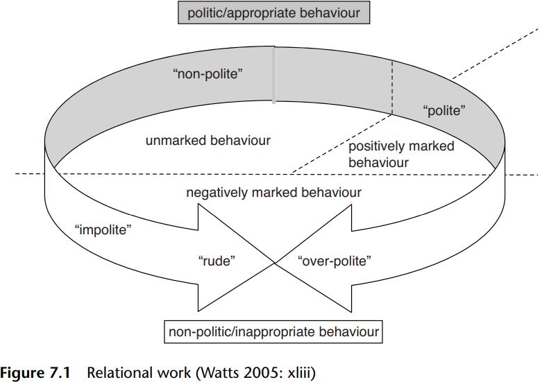 Relational work in this perspective incorporates the issue of whether behavior is marked or not. Markedness here relates to appropriateness; if the behavior is inappropriate, it will be marked and more likely to be noticed. Note that the notion of appropriateness can be viewed in terms of acting in accordance or otherwise with social norms. Unmarked behavior is what Watts (e.g. 2003) refers to in his earlier work as “politic behavior”: “[l]inguistic behavior which is perceived to be appropriate to the social constraints of the ongoing interaction, i.e. as non-salient, should be called politic behavior” (Watts 2003: 19), and is illustrated by the following examples: