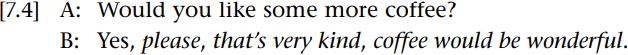 Politeness, on the other hand, is positively marked behavior. Watts (2003: 19) writes that “[l]inguistic behavior perceived to go beyond what is expectable, i.e. salient behavior, should be called polite or impolite depending on whether the behavior itself tends towards the negative or positive end of the spectrum of politeness”. By way of illustration, we can re-work Watts’s examples accordingly: