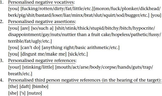 An important point is that relational frameworks are not models of politeness or impoliteness themselves; they are models of interpersonal relations which may accommodate at least some aspects of politeness, impoliteness, and so on. So, while they will provide insights, we cannot expect a complete apparatus for accommodating or explaining the rich array of communicative action undertaken to achieve and/or perceived by participants as achieving impoliteness (see, for example, the descriptions in Culpeper 1996; Bousfield 2008). One obvious difference between politeness and impoliteness is that impoliteness has its own set of conventionalized impolite formulae. We understand conventionalization here in the same way as Terkourafi (e.g. 2003), namely, items conventionalized for a particular context of use. As we saw, for such items to count as polite, they must go unchallenged (e.g. Terkourafi 2005a; see also Haugh 2007b, for a related point). Conversely, then, a characteristic of conventionally impolite formulae is that they are challenged. In Culpeper’s (2011a) data, by far the most frequent impolite formulae type is insults. These fall into the following four groups (all examples are taken from naturally occurring data; square brackets give an indication of structural slots, which are optional to varying degrees, and slashes separate examples):