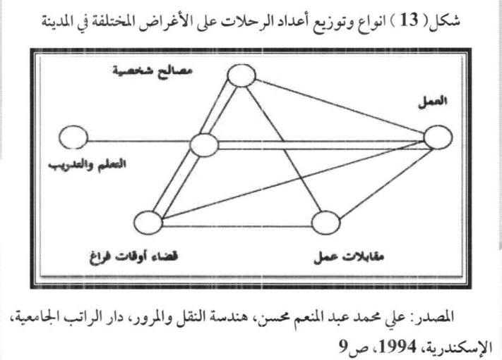 تتوقف إمكانيات التنقل إما على قدرة وسيلة النقل المستخدمة أو على قدرة الهياكل القاعدية، ذا كان النقل يعبر عن حركة السلع فهو بذلك نقل السلع والبضائع من مصادرها إلى أماكن تسويقها واستخدامها، وحسب المعيار الاقتصادي فالسلعة تعـد عديمة النفع وليس لها قيمة اقتصادية ما لم تكن متوافرة في المكان والزمان المطلوبين، فحركة السلع هي الأخرى تعد ضمن نقل شيء مادي لكن يطلق عليها مصطلح نقــل وليس تنقل لأن التنقلات خاصة بحركة الأفراد، والشكل (13)، يبين مختلف الرحلات اليومية التي يقوم بها الأفراد وتوزيعها في المدينة، بحيث تظهر بأنواع مختلفة كالرحلة بين المسكن ومقر العمل المسكن وقضاء أوقات فراغ، العمل وقضاء مصالح شخصية، وغيرها من الرحلات كما يظهرها.