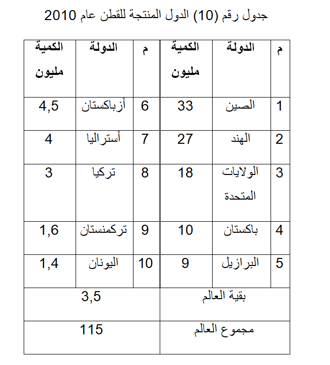 ينتج القطن أكثر من 80 دولة، حتى تطور الإنتاج العالمي من القطن ليصل إلى 115مليون طن، وتحتل الصين المرتبة الأولى 34%، ثم بنحو 19%، ثم الاتحاد السوفيتي في المرتبة الثالثة حيث أنتج 14% من الإنتاج العالمي، ثم الهند التي أنتجت 10% من الإنتاج العالمي. ثم باكستان والبرازيل وتركيا بإنتاج 4% لكل منهما، ومصر 3%، والمكسيك 2,5%، والسودان 1,6%، بل أكثر من نصف الإنتاج 56% يأتي من الثلاث دول الأولى. أما عن أهم الدول المنتجة للقطن: فقد بلغ الإنتاج العالمي من القطن نحو 115 مليون طن والجدول التالي رقم (10) يوضح أهم الدول المنتجة للقطن عام 2010.