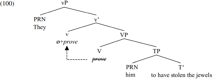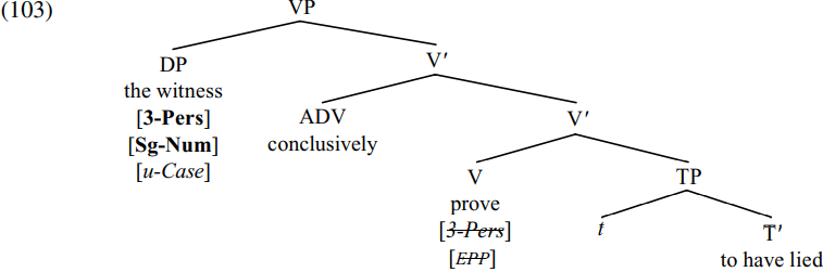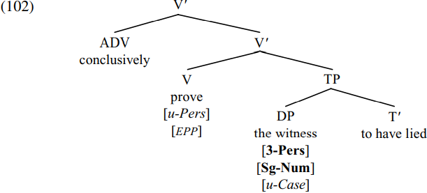 One possibility is that an ECM verb like prove (like infinitival to in raising structures) has an [EPP] feature and an unvalued person feature which together require the closest matching nominal expression which they c-command to be moved to the outer edge of VP. Given this assumption, the relevant part of the derivation of (101a) will proceed as follows. The verb prove merges with the infinitival TP the witness to have lied (whose structure we ignore here, in order to simplify exposition) to form the V-bar prove the witness to have lied, and the adverb conclusively merges with this V-bar to form the even larger V-bar conclusively prove the witness to have lied. Let’s suppose that the witness has valued (third-)person and (singular-)number features, and an unvalued and uninterpretable case feature, so that at this stage we have formed the V-bar shown in simplified form below: