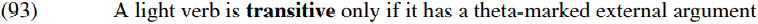 The VP in (103) is then merged as the complement of a null (affixal) light-verb. The light verb is transitive (since it has the external argument the DA), and transitive light verbs carry a complete set of unvalued