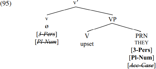 -features) will carry unvalued and uninterpretable person/number features, so forming the v-bar below (with interpretable features shown in bold and uninterpretable features in italics):