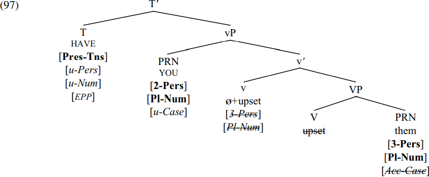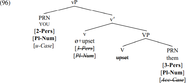 The null light verb is affixal, and so will trigger raising of the verb upset from V to v. Since the (causative) light verb in (95) is transitive, it projects an AGENT external argument. The relevant external argument is YOU in (91), and (if it refers to more than one individual) this enters the derivation with interpretable second-person and plural-number features, but an unvalued case-feature, so forming the vP (96) below: