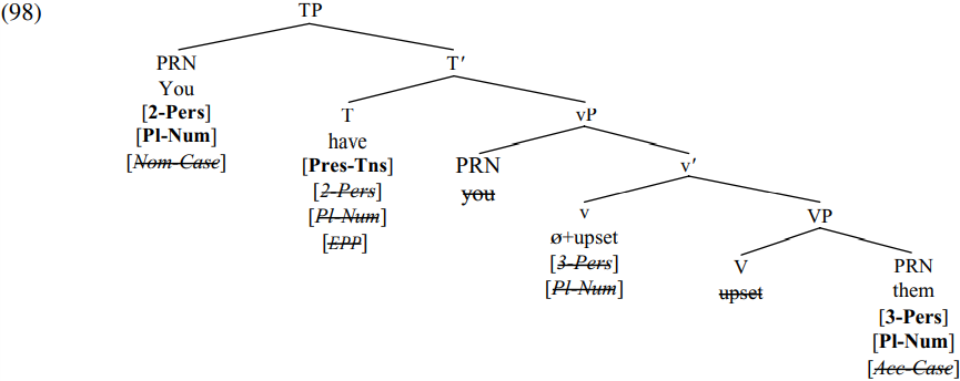 [T HAVE] then probes and locates the pronoun YOU as the only active goal with an unvalued case feature which it c-commands. This results in the pronoun valuing and deleting the person/number features of the auxiliary, and conversely in the auxiliary valuing the case feature of the pronoun as nominative, and deleting it: hence the items HAVE and YOU are spelled out as HAVE and YOU at PF. The [EPP] feature of T triggers raising of the pronoun you from spec-vP to spec-TP (thereby deleting the [EPP] feature on T), deriving the structure (98) below: