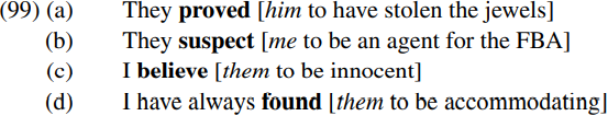 An interesting question arising from the assumption that the objects of transitive verbs are assigned accusative case by a light verb which projects an external argument is whether this analysis can be extended to the case-marking of (italicized) accusative subjects of the (bracketed) infinitival TPs in ECM/Exceptional Case-Marking structures like those below: