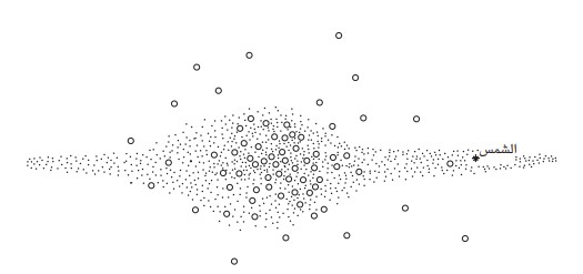 شكل 1-1: توزيع العناقيد الكروية (ممثلة بالدوائر) على أحد جانبي السماء يوضح أن الشمس تبعد كثيرًا عن مركز مجرة درب التبانة.
